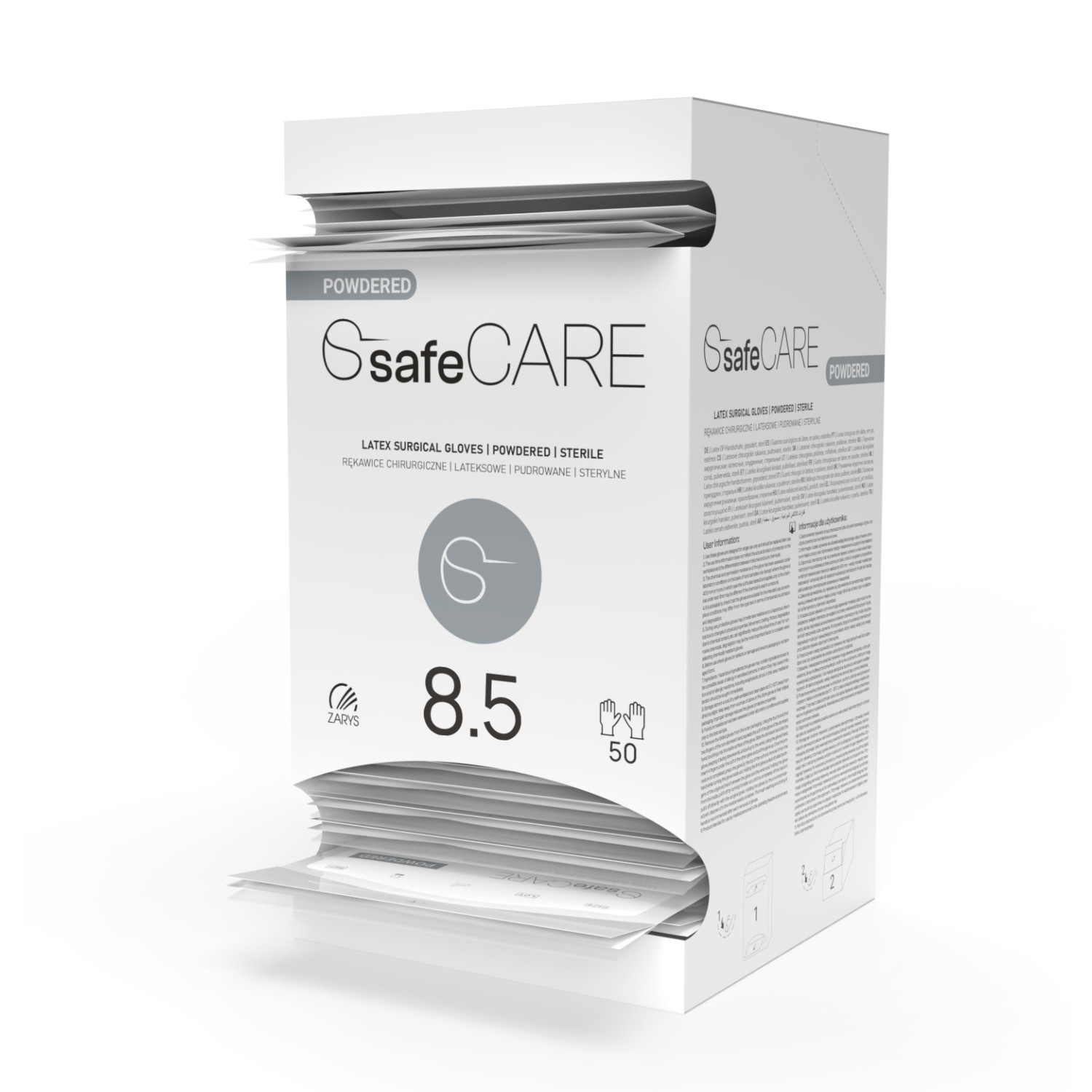 - Rękawice chirurgiczne SafeCare są zapakowane w kartonik, pełniący funkcję dyspensera