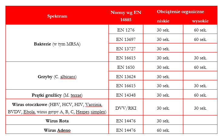 - Działają już od 30 sekund na bakterie, grzyby, prątki gruźlicy, wirusy otoczkowe, Adeno, Rota.