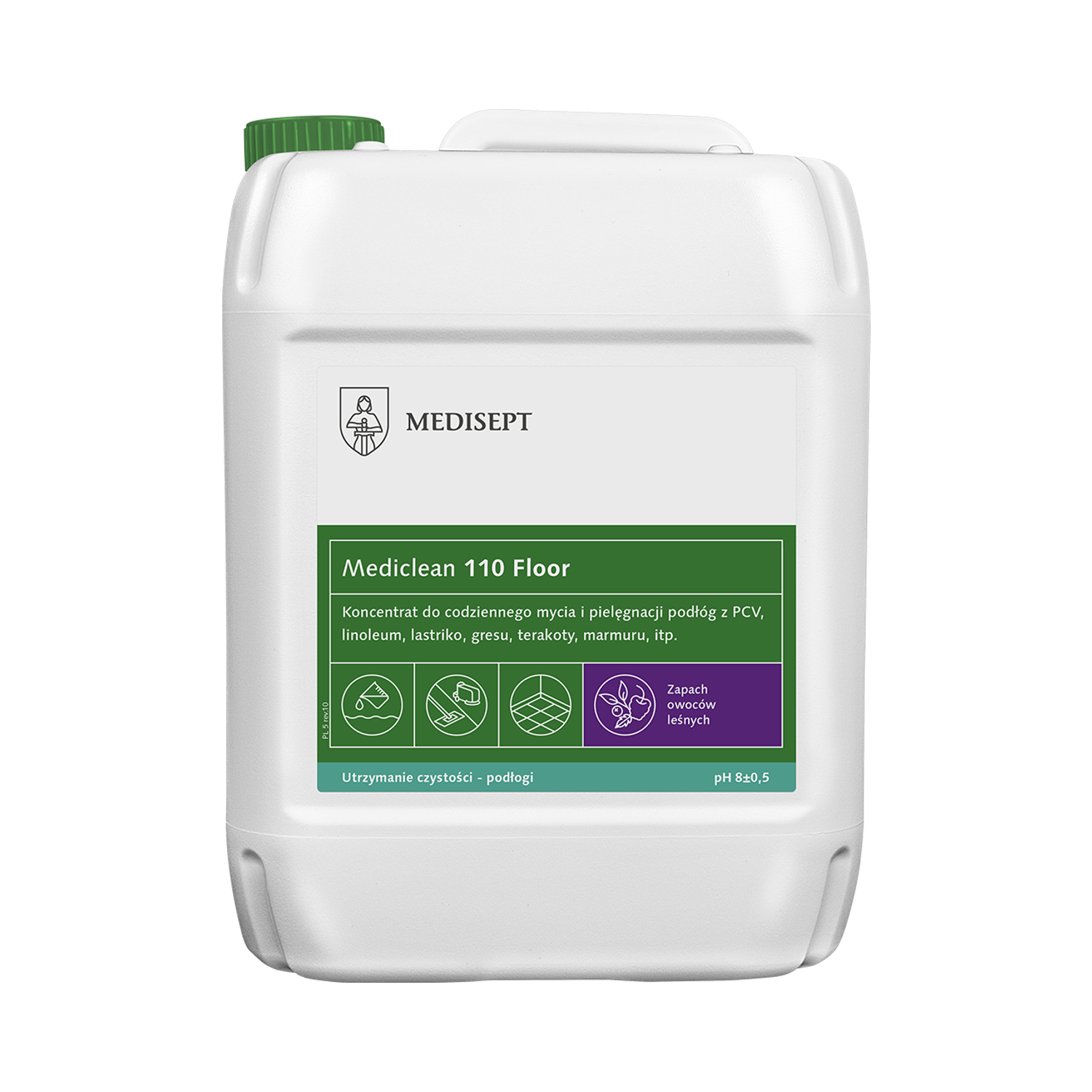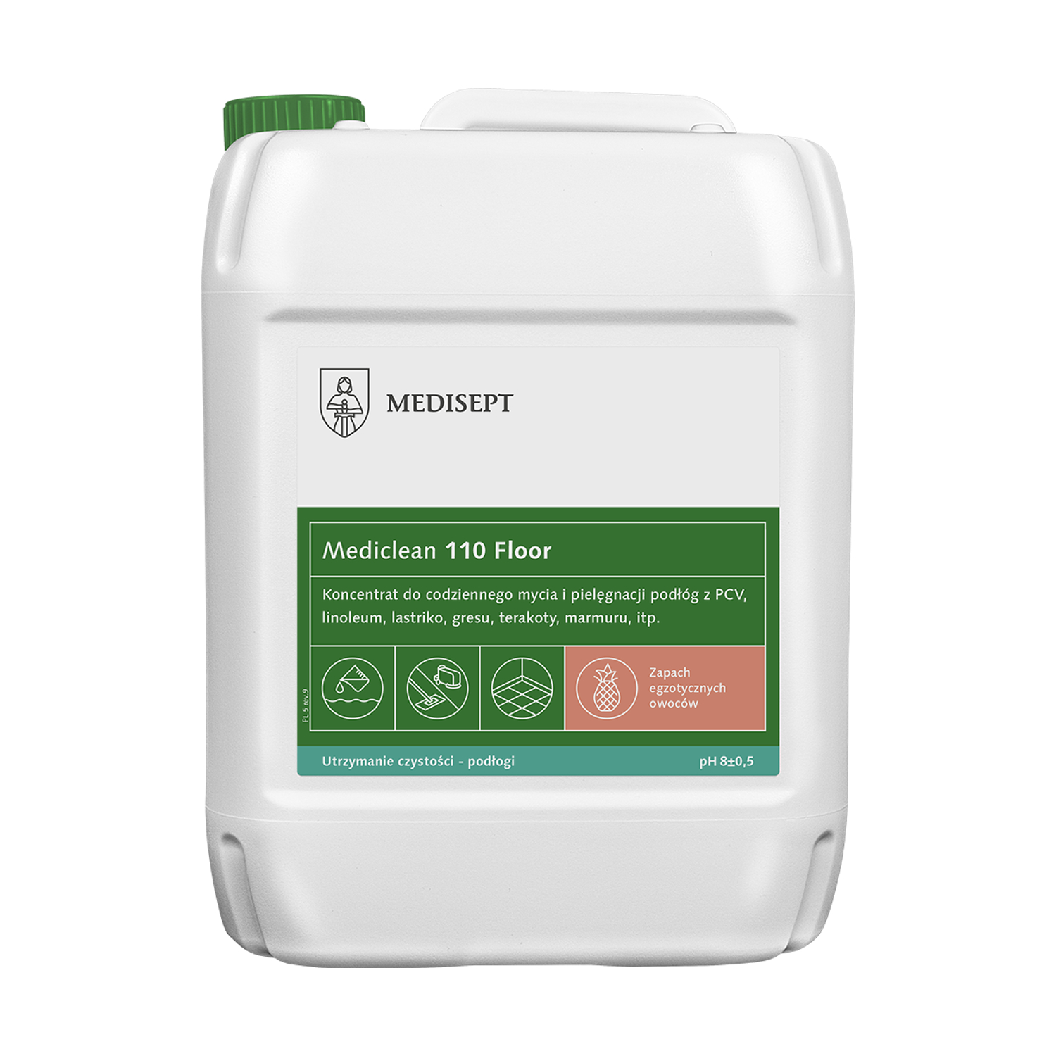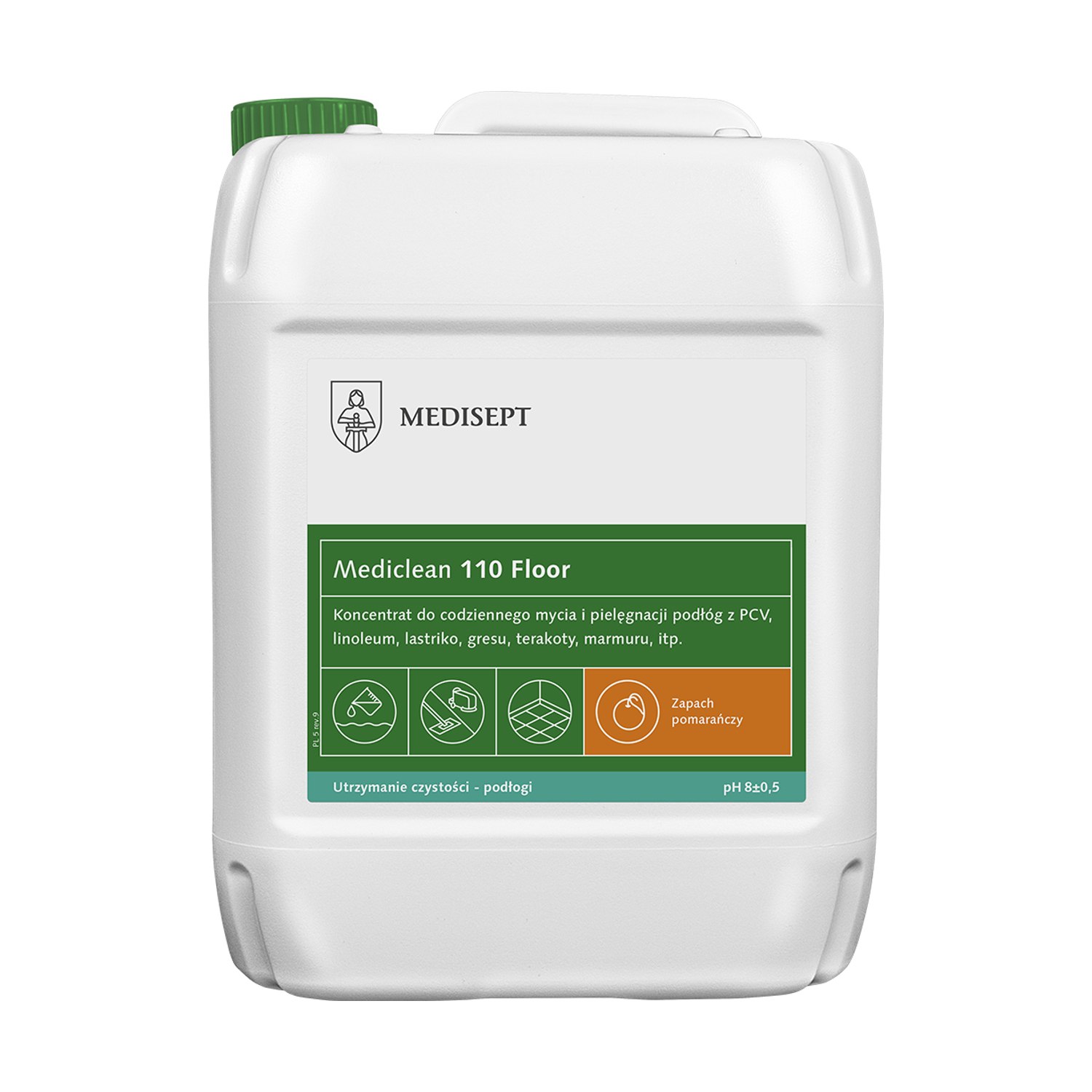 - Mediclean 110 Floor Clean jest preparatem opartym na detergentach niskopieniących do mycia i konserwacji podłóg, zalecanym do codziennego utrzymania czystości i pielęgnacji wszelkich wodoodpornych podłóg, z wyjątkiem wykładzin dywanowych i podłóg z surowego drewna.