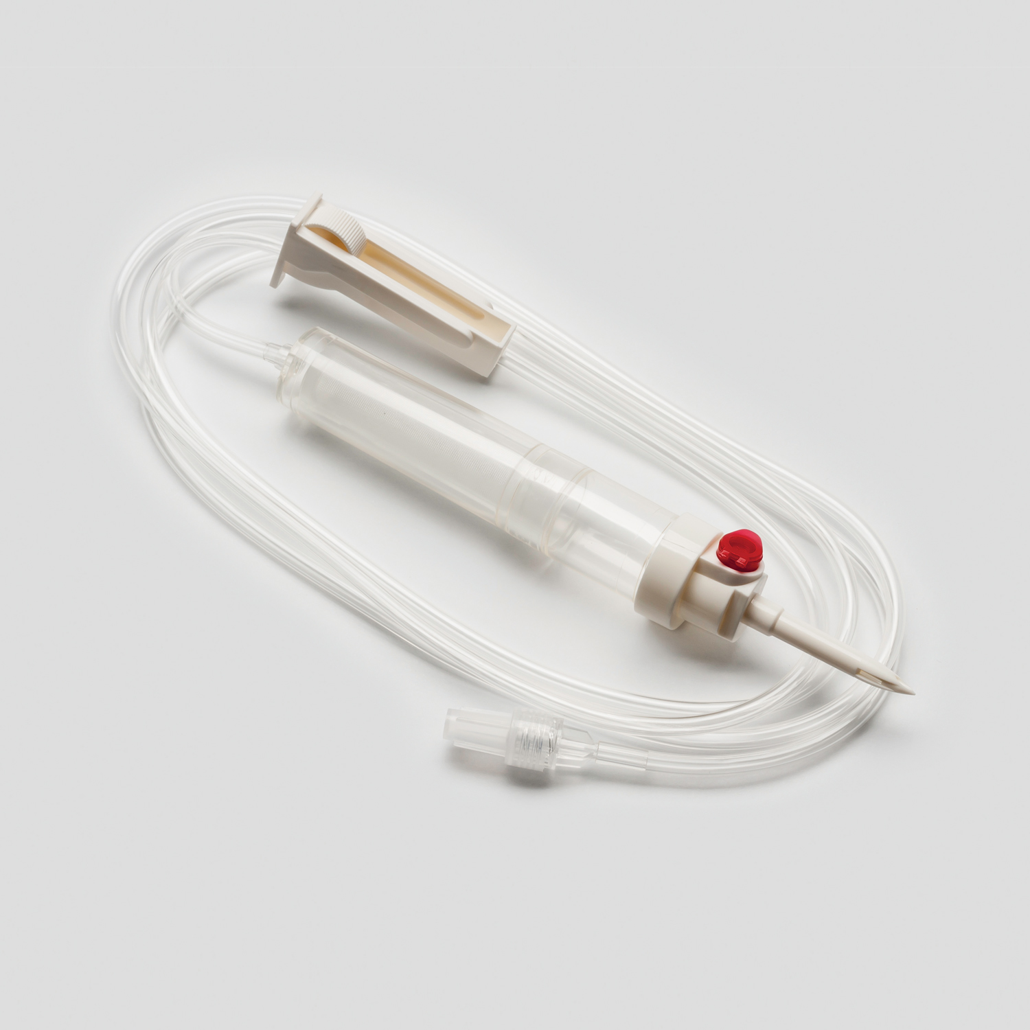 - Ma elastyczną, przezroczystą komorę kroplową.