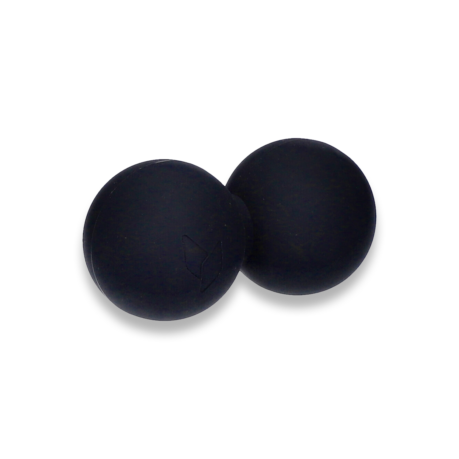 Czarna, silikonowa, podwójna piłeczka do masażu o średnicy 6,5 cm.