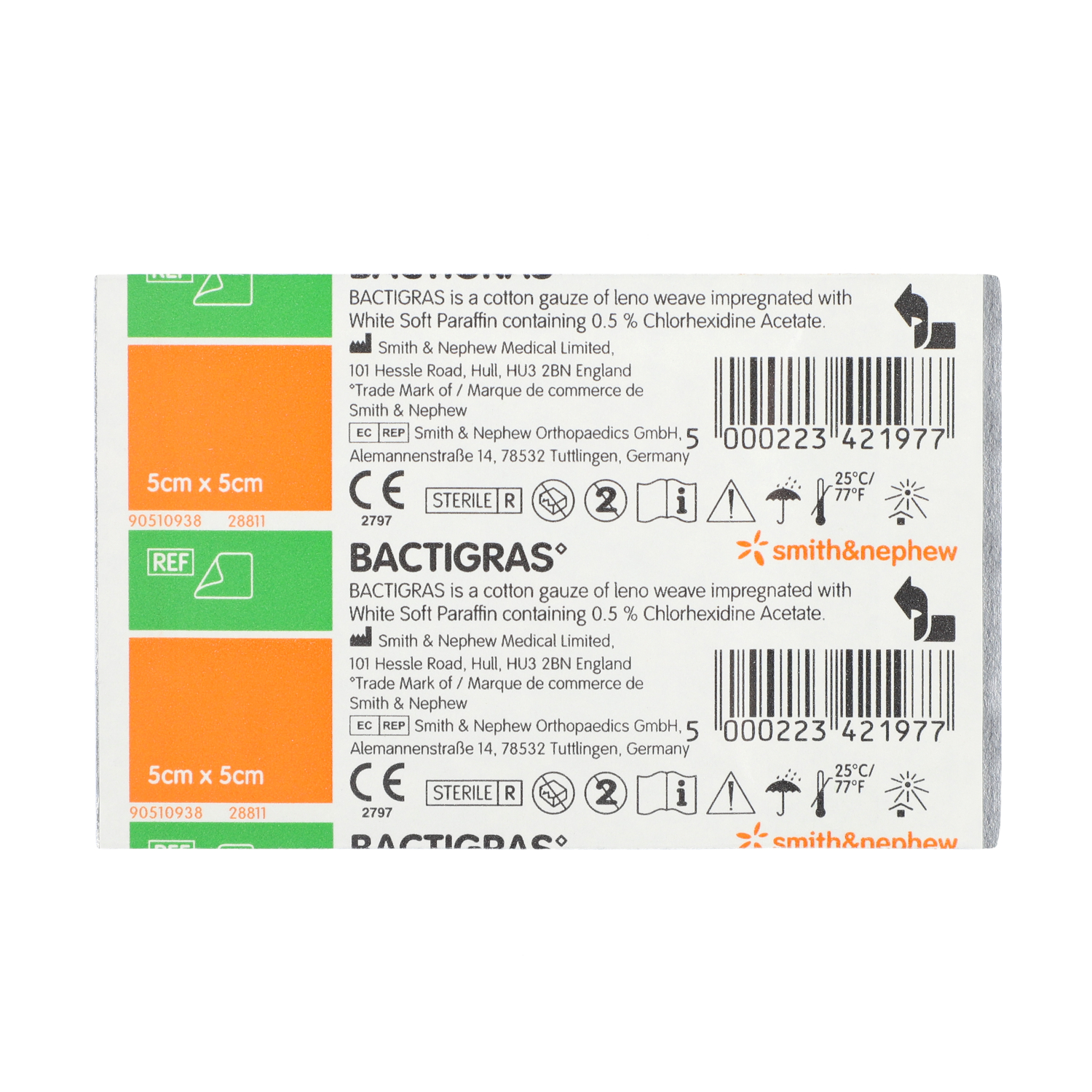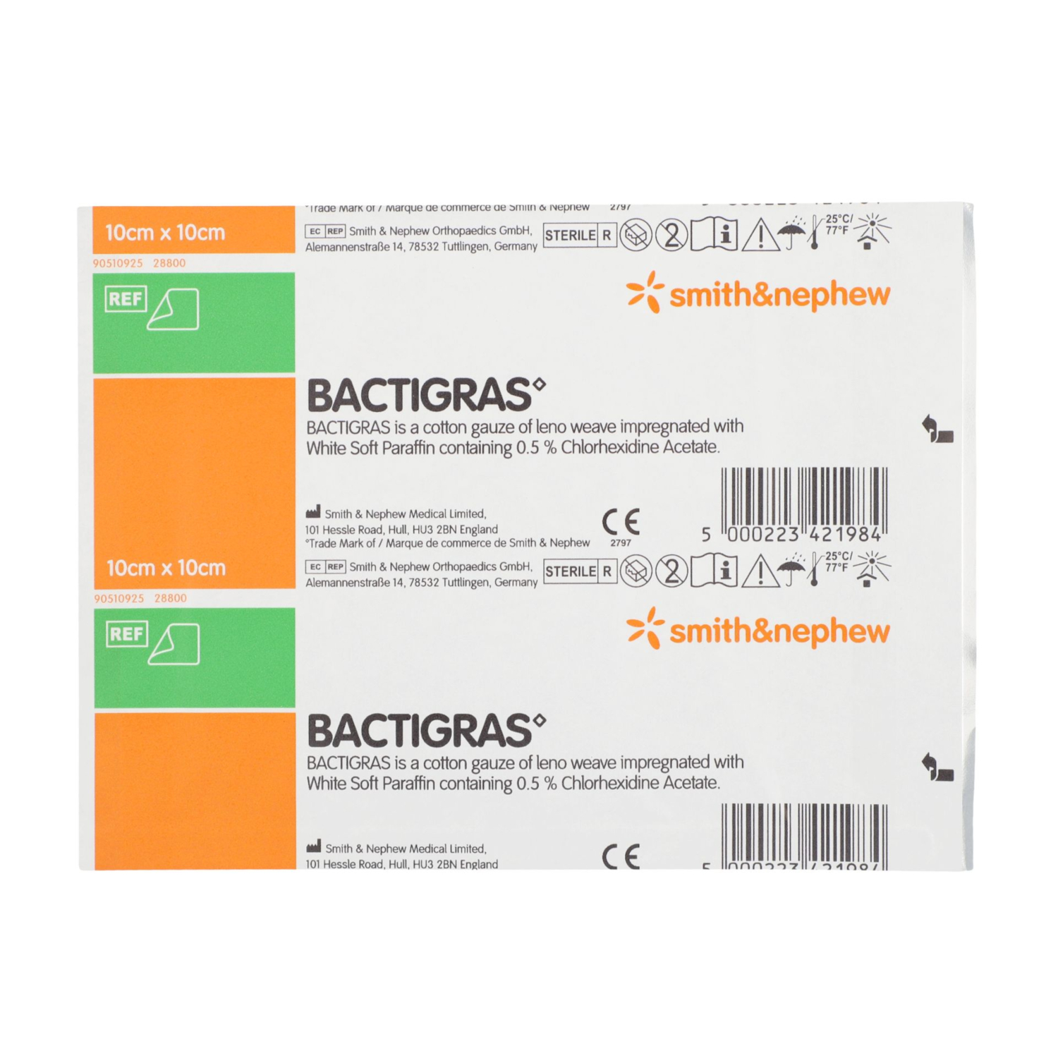 Bactigras jest opatrunkiem wykonanym z gazy, tkanej splotem leno, zaimpregnowanej miękką, białą parafiną zawierającą 0,5% roztwór octanu chlorheksydyny. Bactigras ma udowodnione właściwości antyseptyczne i redukuje ryzyko kolonizacji rany przez bakterie, a także działa bakteriobójczo na już zainfekowanych ranach.