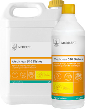- Mediclean 510 Dishes Cytrynowy jest wydajnym płynem w formie koncentratu do ręcznego mycia naczyń, sztućców oraz urządzeń i powierzchni kuchennych.